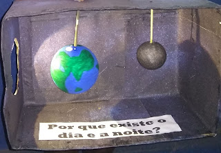 Passamos a utilizar, uma caixa com um furo lateral que representa a luz do Sol que ilumina parte da Terra, onde é dia. E a outra face do planeta, que permanece escura, está de noite. Muitos alunos apresentavam respostas não-convencionais e muitas dúvidas sobre o dia e a noite. Foi o momento oportuno, para explicar e observar como o movimento de rotação acontece. Segue algumas fotos do experimento feito em sala de aula: